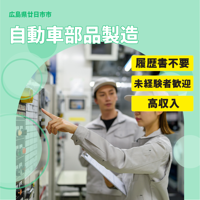 給与詳細 月収例 255,000円 日給例 12,750円 勤務地 広島県廿日市市 仕事内容 自動車部品の製造スタッフを募集します。主な作業は、スポット溶接機を使用したボルト固定作業および、必要な部品をロボットへセットする簡易作業です。いずれも習得しやすく、未経験者でも対応可能な内容です。黙々と作業することが得意な方に向いており、長期的な就業が見込める現場です。