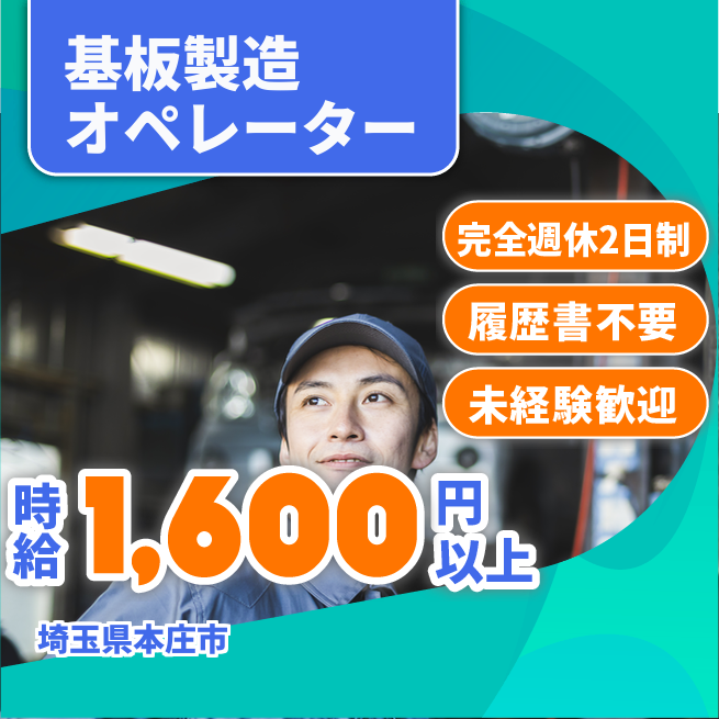 給与詳細 月収例 280,000円 時給例 1,600円 勤務地 埼玉県本庄市 仕事内容 プリント基板の原料投入、機械オペレーター、プレス加工