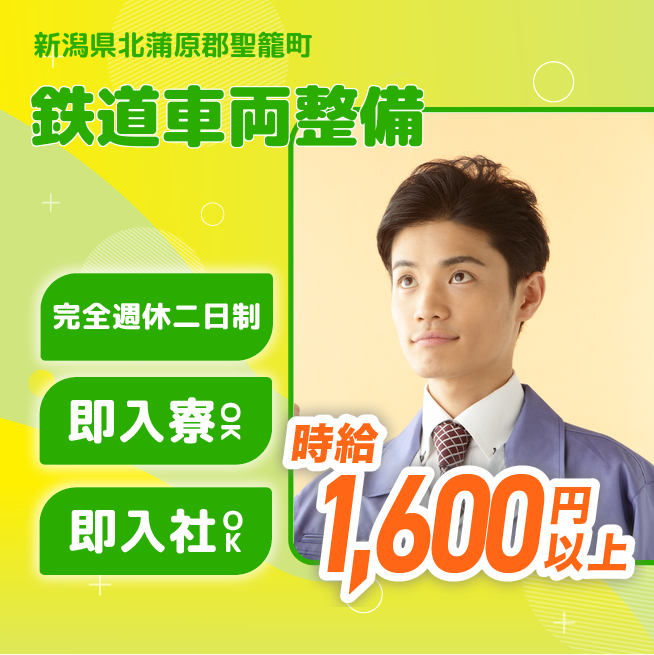 給与詳細 月収例 277,200円 時給例 1,650円 勤務地 新潟県北蒲原郡聖籠町 仕事内容 鉄道会社の車両メンテナンス業務です。