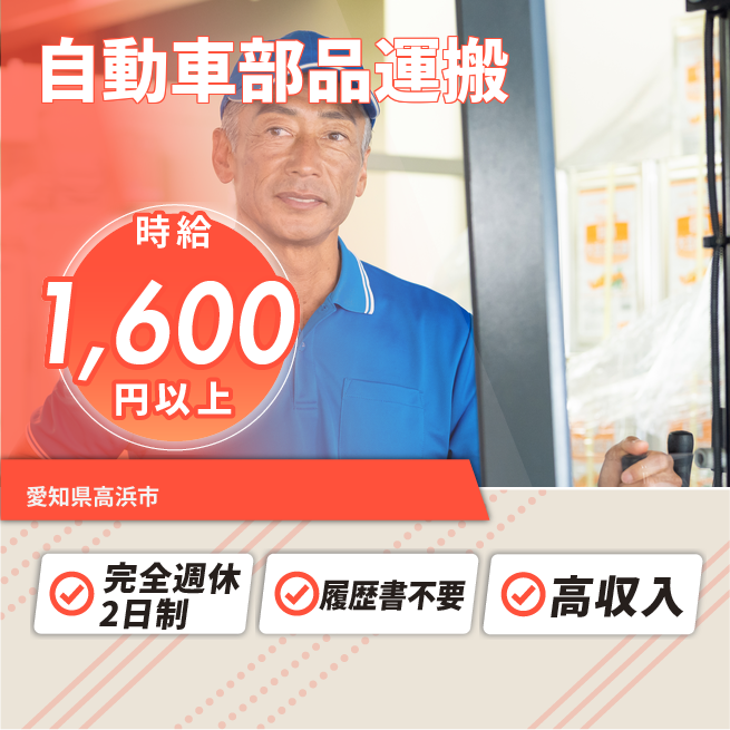 給与詳細 月収例 324,000円 時給例 1,650円 勤務地 愛知県高浜市 仕事内容 :フォークリフトでの自動車部品運搬作業。エレカでの自動車部品の運搬作業。ハンドリフトでの自動車部品の運搬作業。その他自動車部品の運搬、仕分け作業。