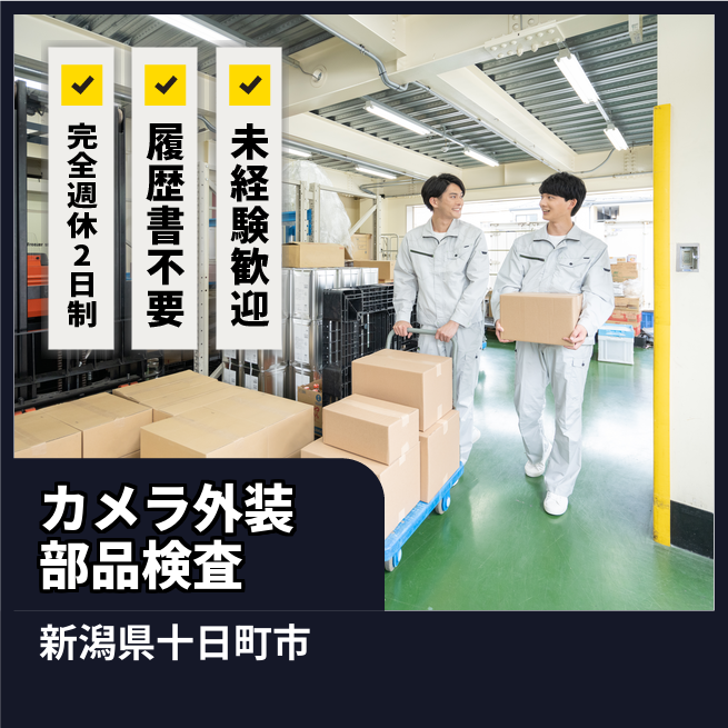 給与詳細 月収例 167,200円 時給例 1,045円 勤務地 新潟県十日町市 仕事内容 【業務内容詳細】?カメラなどの外装プラスチック部品の成形機から射出後の検査、バリ取り、箱詰め業務【取扱製品情報】?プラスチック成形・プラスチック塗装・印刷・組立の会社