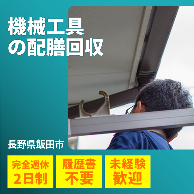 給与詳細 月収例 246,000円 日給例 12,300円 勤務地 長野県飯田市 仕事内容 製品の加工に使用する刃物の準備・各工程への配膳・回収業務