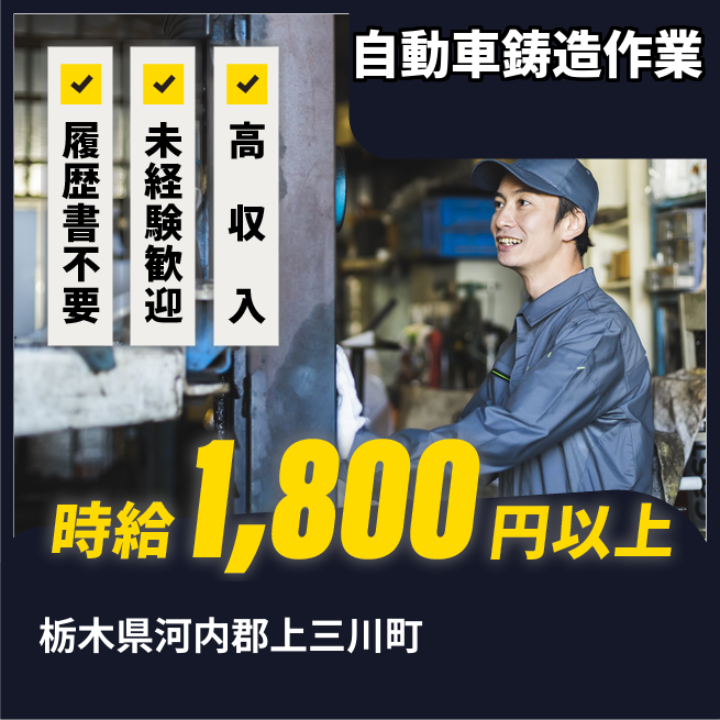 給与詳細 月収例 256,000円 時給例 1,850円 勤務地 栃木県河内郡上三川町 仕事内容 自動車部品の鋳造、その他付随業務