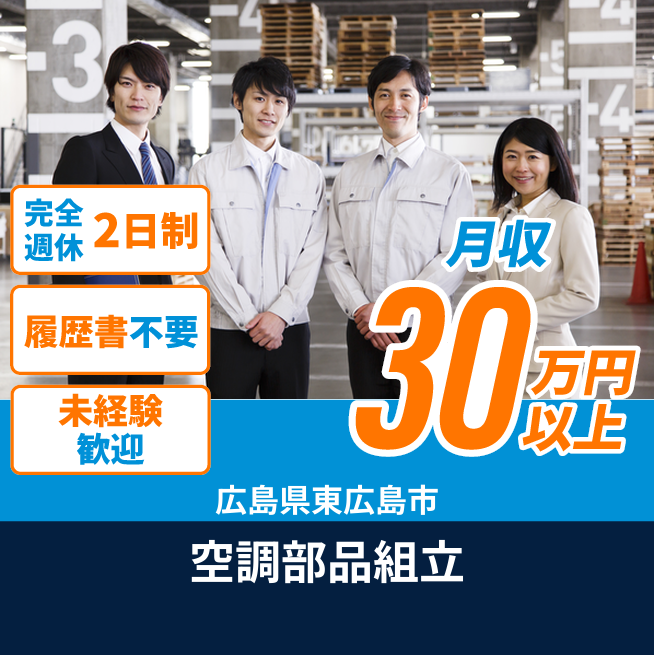 給与詳細 年収例 4,860,000円 月収例 405,000円 勤務地 広島県東広島市 仕事内容 【業務内容】自動車用空調・冷却部品の製造作業