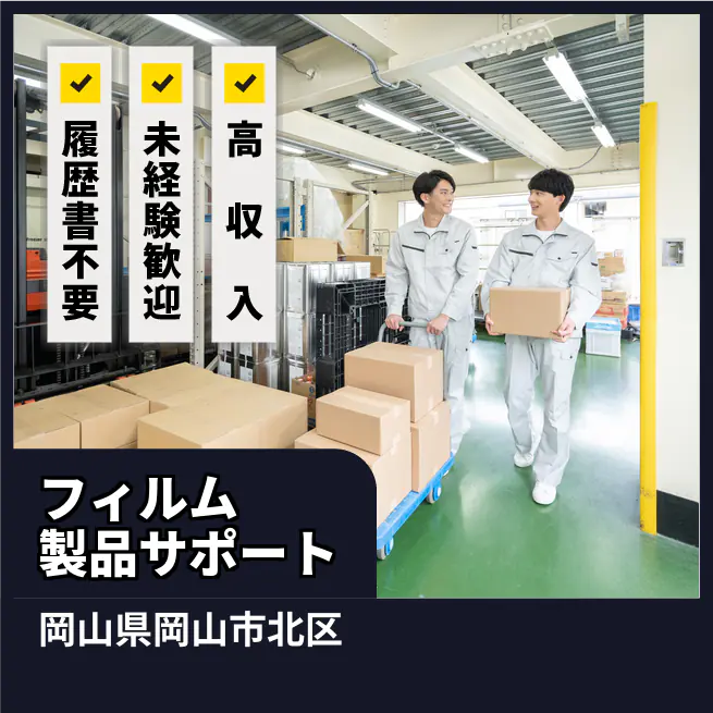 給与詳細 月収例 292,500円 日給例 12,000円 勤務地 岡山県岡山市北区 仕事内容 【業務内容】フィルム製品の製造サポート業務