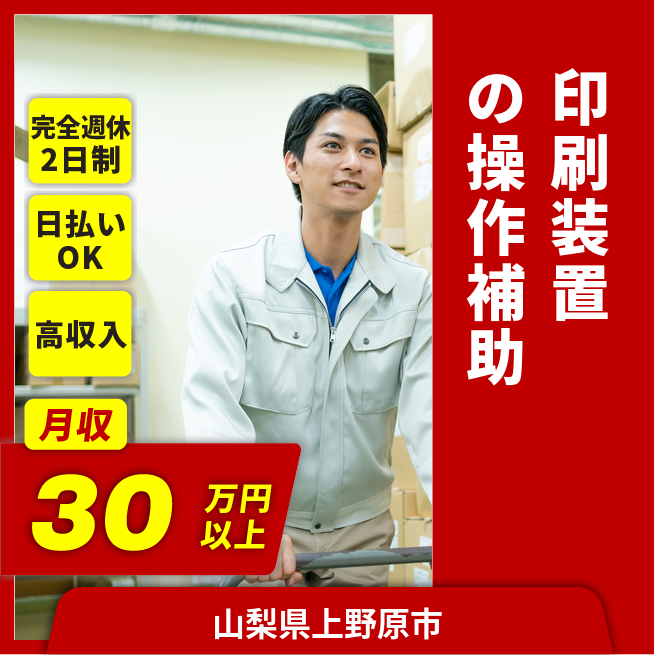給与詳細 月収例 306,000円 日給例 11,600円 勤務地 山梨県上野原市 仕事内容 【印刷装置操作補助及び付随業務】