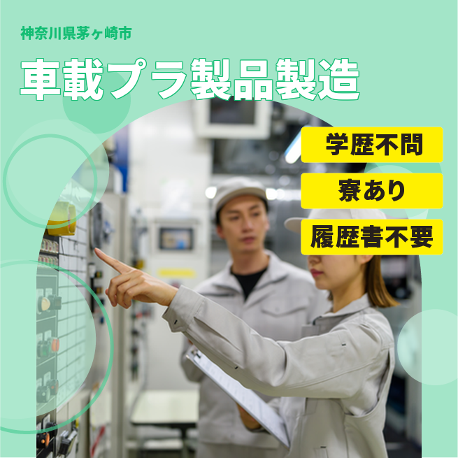 車載用プラスチック製品の成型、組立オペレーター、完成品の検査、梱包