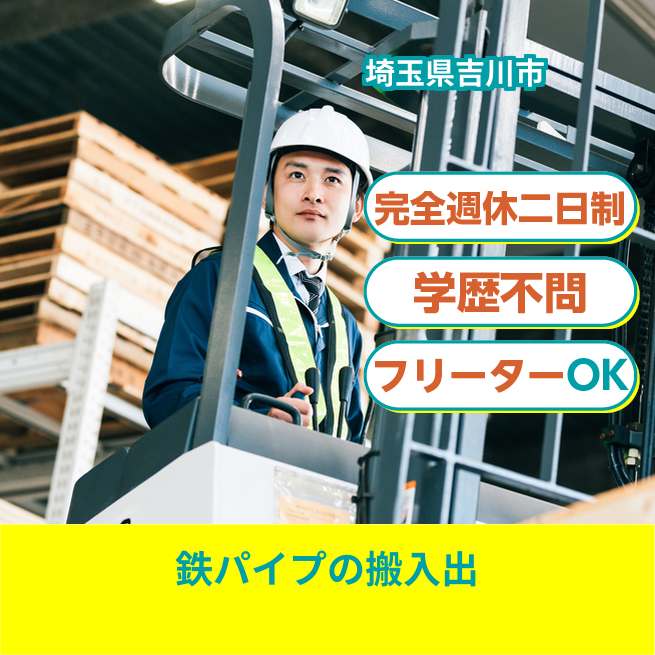 給与詳細 月収例 224,000円 日給例 11,200円 勤務地 埼玉県吉川市 仕事内容 土木建築資材である鉄パイプの搬入・搬出作業を担当します。クレーンを用いた資材の吊り上げ、移動、設置における玉掛け作業が中心です。その他、業務に付随する準備、片付け、整理整頓などもあります。