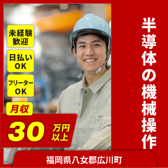 給与詳細 月収例 300,000円 時給例 1,235円 勤務地 福岡県八女郡広川町 仕事内容 【機械で電子部品製造】