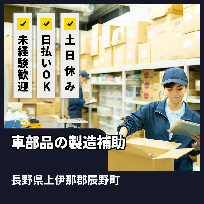 給与詳細 月収例 220,000円 時給例 1,210円 勤務地 長野県上伊那郡辰野町 仕事内容 【車パーツの製造補助】
