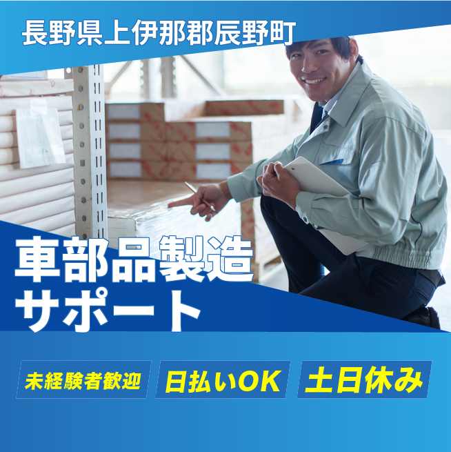 ※規定あり 交通費 支給あり 応募の流れ 本ページ内<応募する>ボタンより、必要項目をご入力の上、ご応募ください。 勤務地 【勤務地】長野県上伊那郡辰野町樋口 勤務時間 【勤務地】8:30~17:30(休憩45分+小休憩15分)