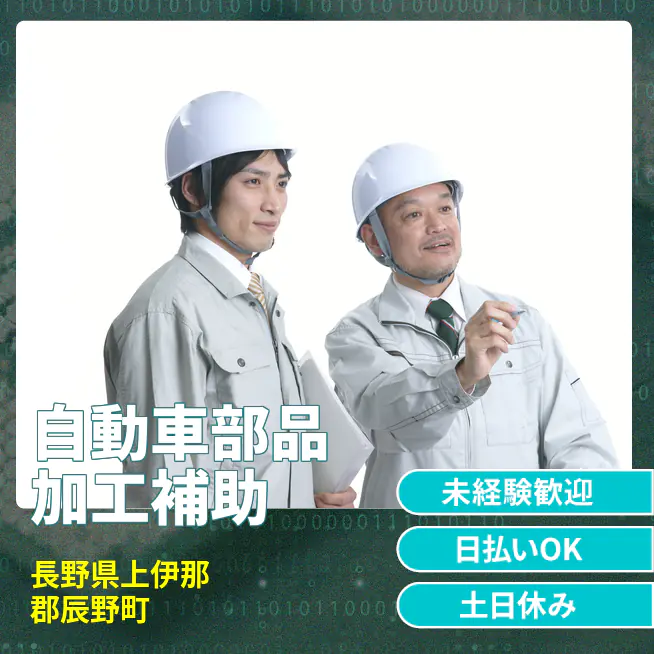 ◆日払い・仮払いOK(アプリでカンタン申請!) 交通費 支給あり 応募の流れ 本ページ内<応募する>ボタンより、必要項目をご入力の上、ご応募ください。 勤務地 【勤務地】長野県上伊那郡辰野町樋口 勤務時間 【勤務地】8:30~17:30(休憩45分+小休憩15分)