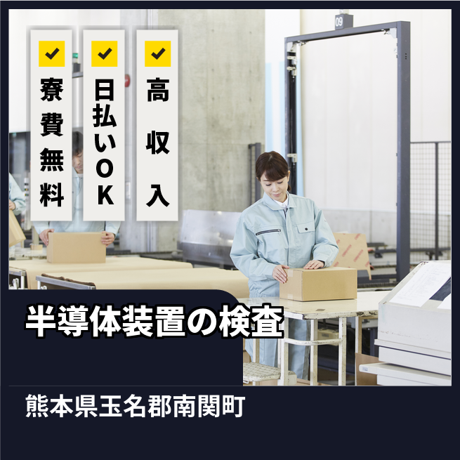 給与詳細 月収例 270,000円 日給例 11,200円 勤務地 熊本県玉名郡南関町 仕事内容 【半導体製造装置の検査】