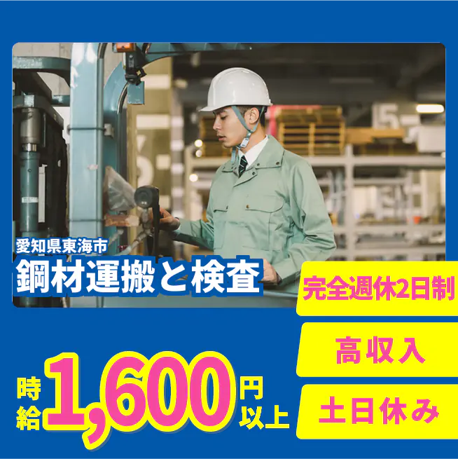 ※各規定あり 交通費 支給なし 応募の流れ 本ページ内<応募する>ボタンより、必要項目をご入力の上、ご応募ください。 勤務地 【勤務地】愛知県東海市- 勤務時間 【勤務地】(日勤)8:00~17:00