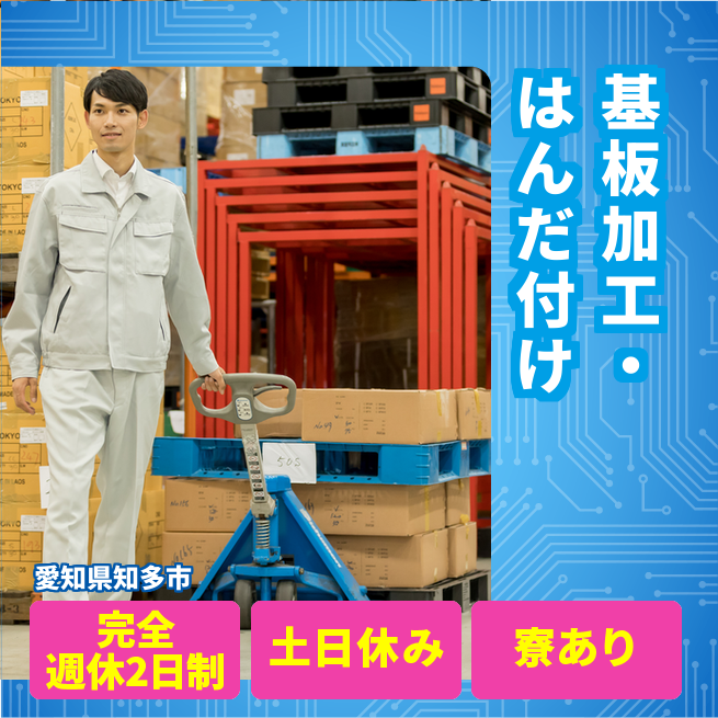 給与詳細 月収例 224,000円 日給例 11,200円 勤務地 愛知県知多市 仕事内容 手のひらサイズの電子基板の加工・はんだ付けの軽作業(寮完備)