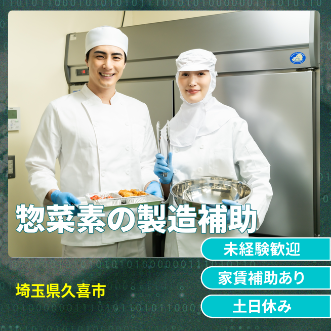 給与詳細 月収例 200,000円 日給例 10,000円 勤務地 埼玉県久喜市 仕事内容 ウィルオブ・ワークの正社員としてお惣菜の素の製造工場にて就業いただきます。