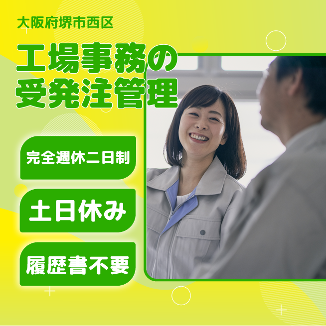 給与詳細 月収例 216,000円 日給例 10,800円 勤務地 大阪府堺市西区 仕事内容 \受発注管理・営業サポート事務スタッフ募集/
