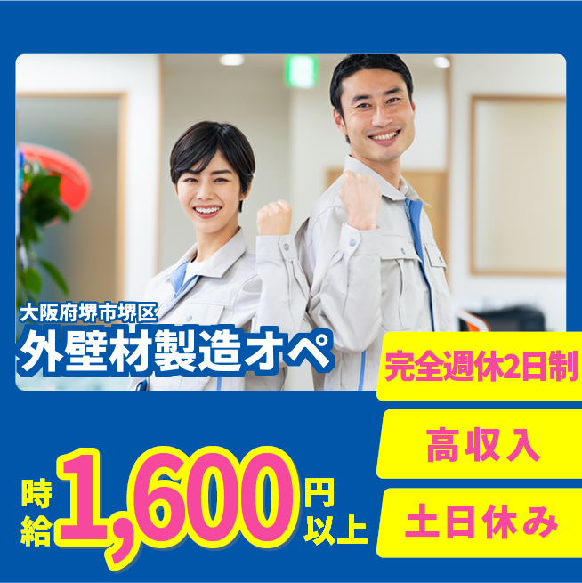給与詳細 月収例 259,200円 時給例 1,620円 勤務地 大阪府堺市堺区 仕事内容 \外壁材製造オペレーションスタッフ募集/