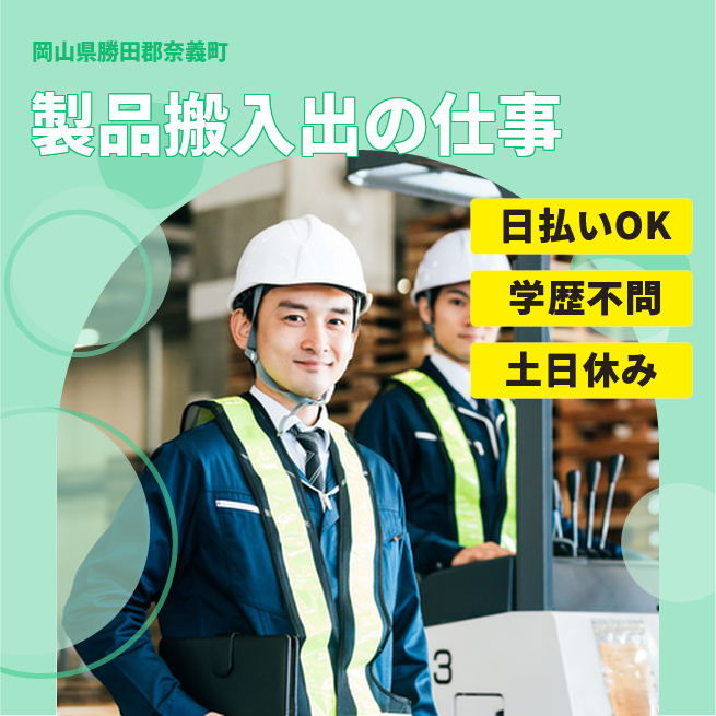 (時給1,200円×実働8時間×21日+交通費) 交通費 支給あり 応募の流れ 本ページ内<応募する>ボタンより、必要項目をご入力の上、ご応募ください。 勤務地 【勤務地】岡山県勝田郡奈義町柿 勤務時間 【勤務地】★勤務時間