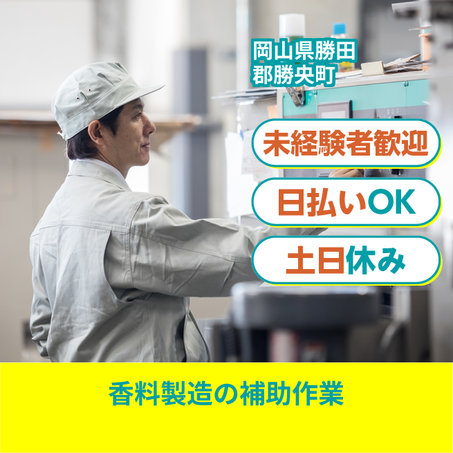 給与詳細 月収例 196,875円 時給例 1,250円 勤務地 岡山県勝田郡勝央町 仕事内容 【業務内容】 香料製造の補助作業と器具の洗浄
