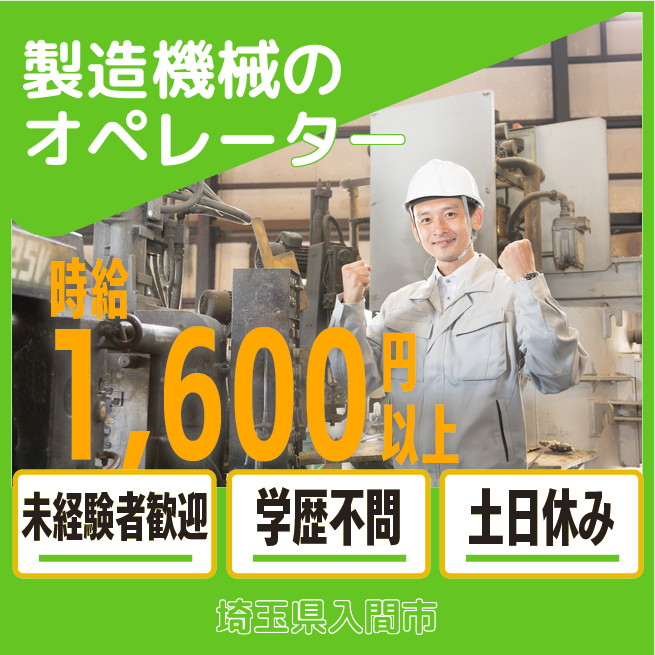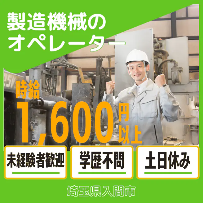 ■段階的にスキルを身につけられる 寮・社宅 寮あり(有料) 求人番号 109355-1Cz 給与詳細 時給例 1,600円 月収例 296,000円 交通費 支給あり 応募の流れ 本ページ内<応募する>ボタンより、必要項目をご入力の上、ご応募ください。 勤務地 【勤務地】埼玉県入間市- 勤務時間 【勤務地】・6:30~15:30(実働8時間/休憩1時間) ・8:30~17:30(実働8時間/休憩1時間)