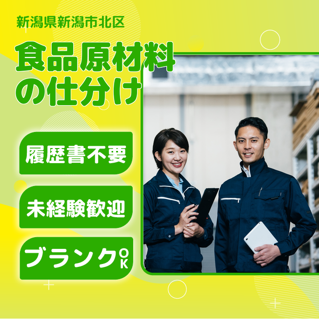 給与詳細 月収例 257,400円 日給例 10,560円 勤務地 新潟県新潟市北区 仕事内容 食品工場内での原材料の仕分け、ピッキングの仕事