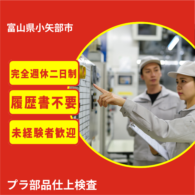 給与詳細 月収例 230,000円 日給例 11,500円 勤務地 富山県小矢部市 仕事内容 プラスチック製品の2次加工(仕上げ、梱包、他)及びプラスチック製品の外観検査