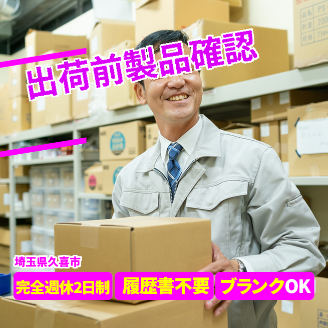 給与詳細 月収例 263,250円 日給例 10,800円 勤務地 埼玉県久喜市 仕事内容 【業務内容】製品のチェックと梱包作業
