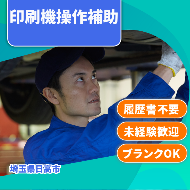 給与詳細 月収例 273,000円 日給例 11,200円 勤務地 埼玉県日高市 仕事内容 印刷機の機械OP(機械操作)はじめは補助作業(印刷するものの準備等)から行います。重力物なし。立作業。重いものはハンドリフトを使用して運びます。