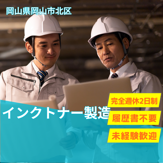 給与詳細 月収例 292,500円 日給例 12,000円 勤務地 岡山県岡山市北区 仕事内容 インクトナーの製造。機械加工オペレーター。