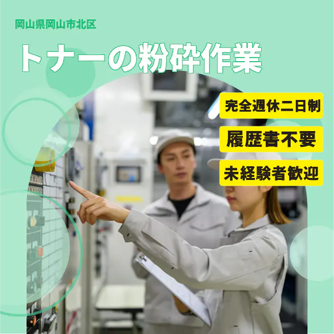 給与詳細 月収例 292,500円 日給例 12,000円 勤務地 岡山県岡山市北区 仕事内容 【業務内容】インクトナー製造における機械加工オペレーター業務
