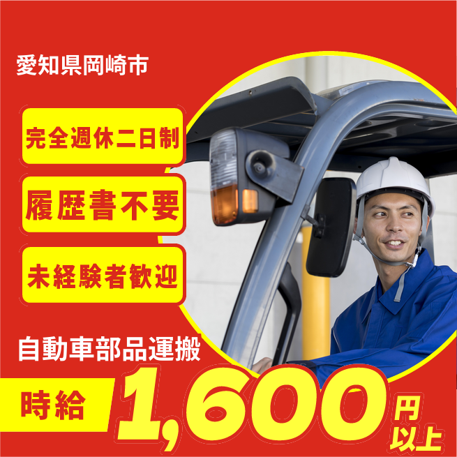 給与詳細 月収例 330,000円 時給例 1,650円 勤務地 愛知県岡崎市 仕事内容 自動車部品のリフト運搬 8:2でリフト:仕分け
