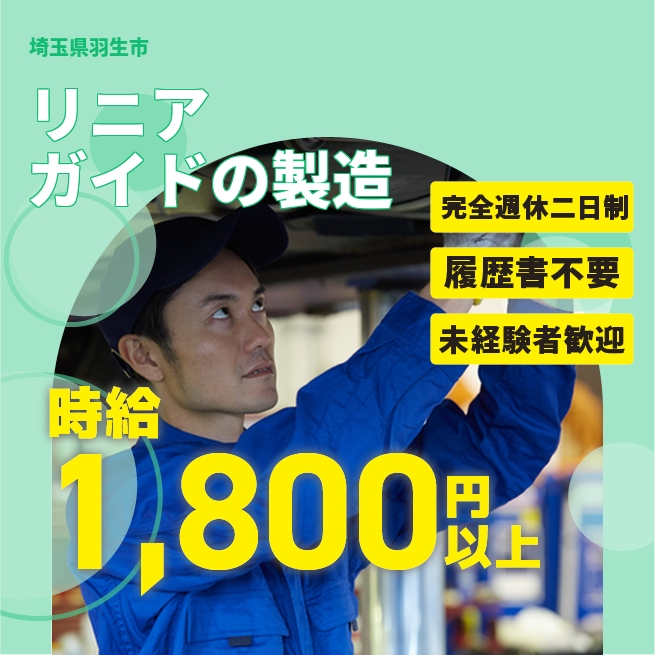 給与詳細 月収例 270,000円 時給例 1,800円 勤務地 埼玉県羽生市 仕事内容 産業機械部品の切削・研削・組立作業をお願いします。