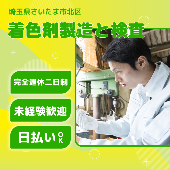 給与詳細 月収例 265,000円 日給例 12,000円 勤務地 埼玉県さいたま市北区 仕事内容 プラスチック着色剤の製造及び付帯業務