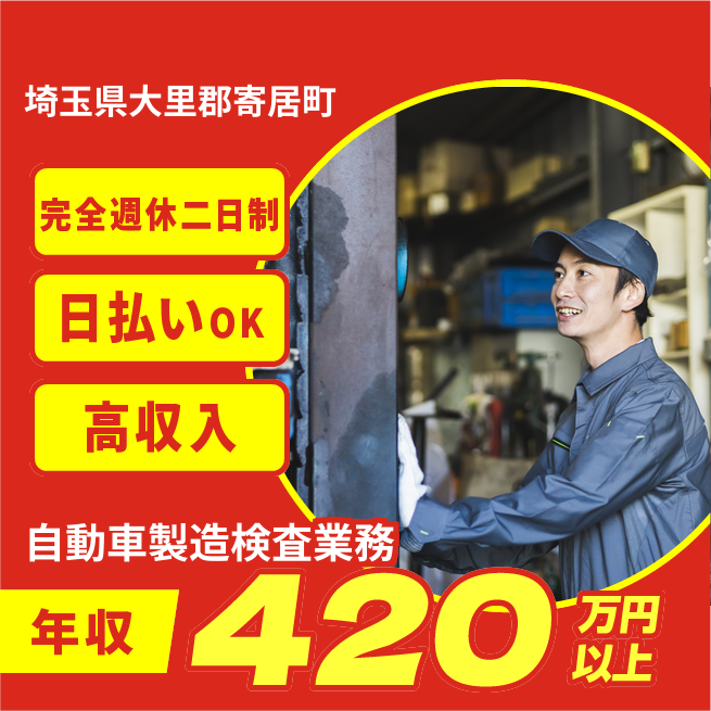 給与詳細 年収例 4,200,000円 月収例 350,000円 勤務地 埼玉県大里郡寄居町 仕事内容 自動車製造、検査及び付帯業務