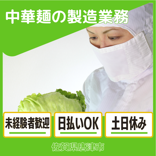 給与詳細 月収例 240,000円 時給例 1,200円 勤務地 佐賀県唐津市 仕事内容 【中華麺の製造】