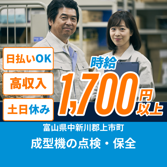 給与詳細 月収例 260,000円 時給例 1,700円 勤務地 富山県中新川郡上市町 仕事内容 【成型機の点検・保全】