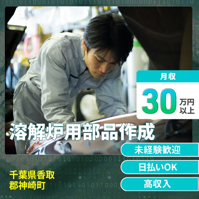 給与詳細 月収例 330,000円 時給例 1,900円 勤務地 千葉県香取郡神崎町 仕事内容 【業務内容】 溶解炉パーツ製造に関する作業