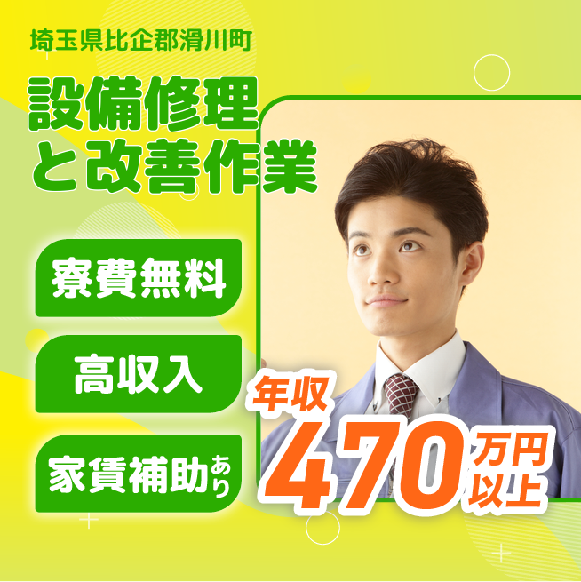 引っ越し費用:本人移動費用は会社負担致しますが、荷物送料は自己負担になります。 機械保全のスキルを活かした仕事を行いたい方にお勧めです。