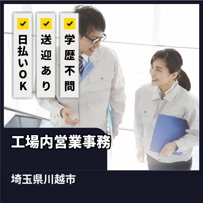 賞与手当含【退職手当】制度あり 交通費 支給あり 応募の流れ 本ページ内<応募する>ボタンより、必要項目をご入力の上、ご応募ください。 勤務地 【勤務地】埼玉県川越市下小坂 勤務時間 【勤務地】《時間1》08:30~17:30