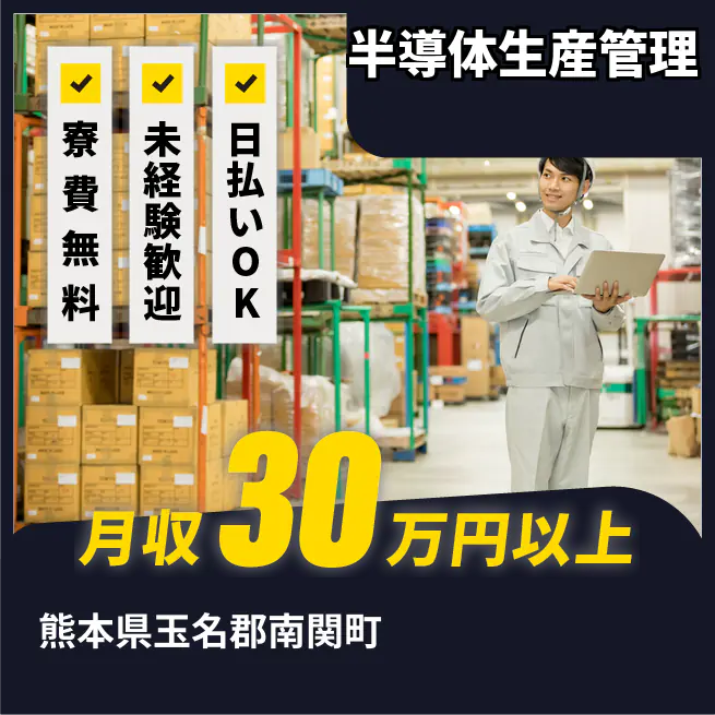 給与詳細 月収例 301,500円 時給例 1,800円 勤務地 熊本県玉名郡南関町 仕事内容 【半導体製造メーカーでの生産管理業務】