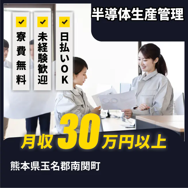 給与詳細 月収例 301,500円 時給例 1,800円 勤務地 熊本県玉名郡南関町 仕事内容 【業務内容】