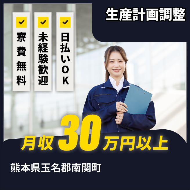 給与詳細 月収例 301,500円 時給例 1,800円 勤務地 熊本県玉名郡南関町 仕事内容 【業務内容】