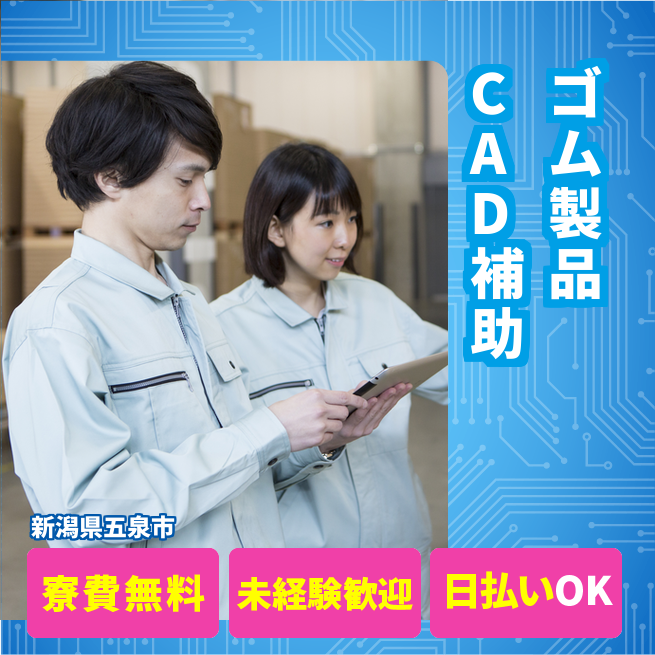 自動車や産業機械に使用されるゴム製品を製造している工場にて、設計部門のサポート業務(設計補助)を担当していただきます。