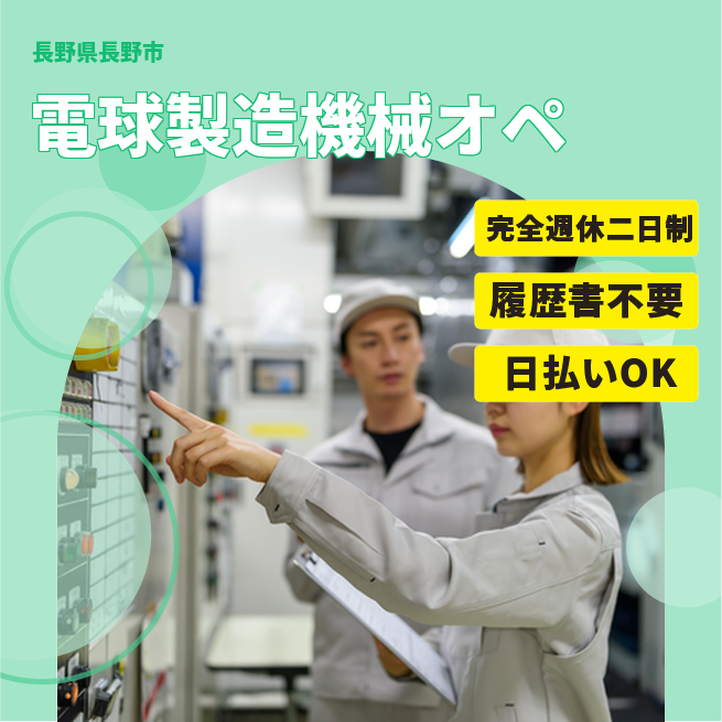 就業場所:全国(派遣先)/就業範囲:派遣先業務全般(詳細は就業条件明示書で明示する) 社員への登用前提の自動車用電球の工場での機械オペレーター