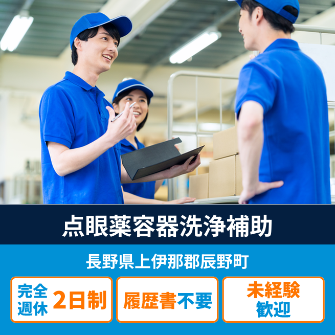 給与詳細 月収例 234,000円 時給例 1,200円 勤務地 長野県上伊那郡辰野町 仕事内容 点眼薬を製造している会社にて容器洗浄の