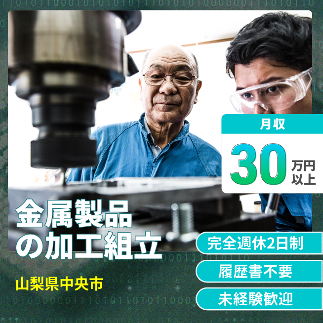 給与詳細 月収例 302,250円 日給例 12,400円 勤務地 山梨県中央市 仕事内容 金属製品の製造に伴う組立・加工作業(機械オペレーター)付随業務