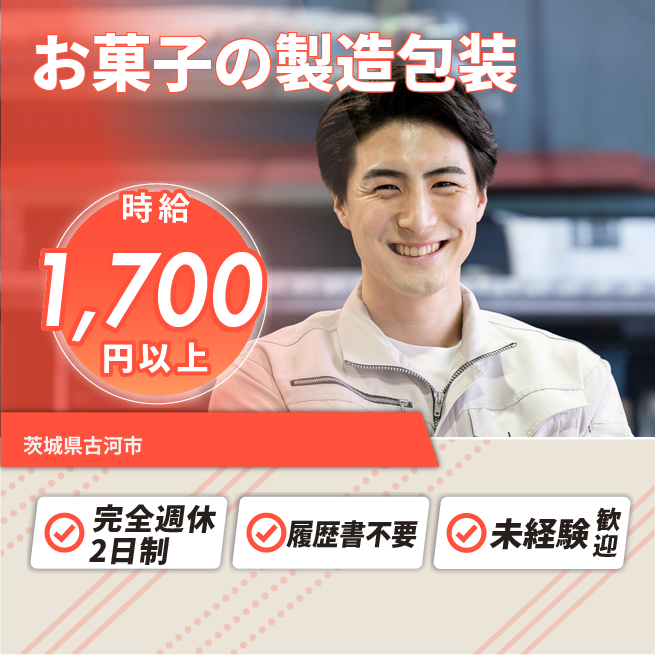 給与詳細 月収例 250,000円 時給例 1,730円 勤務地 茨城県古河市 仕事内容 ◆お菓子の製造・包装・梱包作業になります。パッケージの検品、お菓子の選別、箱詰め、整列、原料投入等を行っていただきます。配属される部署により作業内容異なります。