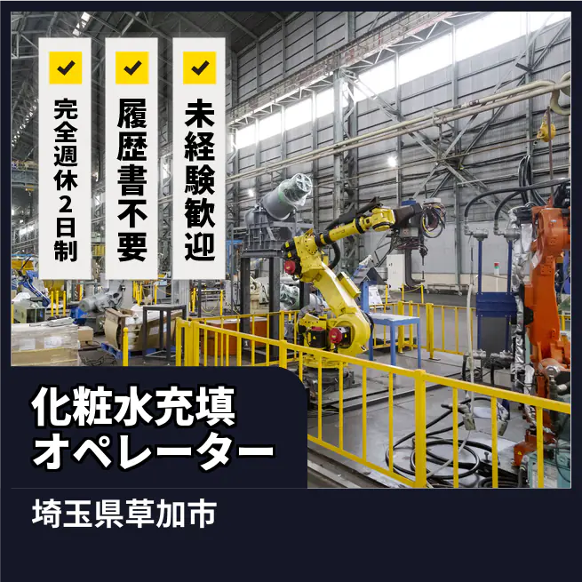 給与詳細 月収例 282,750円 日給例 11,600円 勤務地 埼玉県草加市 仕事内容 クリーンルーム内での化粧水の充填オペレーター業務