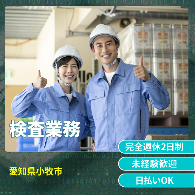 ※実際と異なるケースもございます。 交通費 支給あり 応募の流れ 本ページ内<応募する>ボタンより、必要項目をご入力の上、ご応募ください。 勤務地 【勤務地】愛知県小牧市岩崎 勤務時間 【勤務地】①08:0~17:30 休憩60分